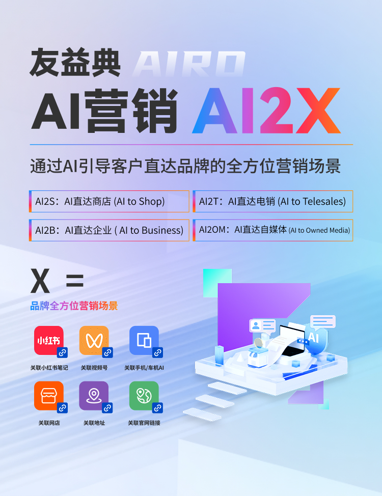 友益典AI营销-AI2X服务,让客户通过AI直达品牌的全方位营销场景,通过AIRO (AI Result optimization)技术,让DeepSeek、元宝、豆包等主流AI主动推荐目标品牌的信息,同时在结果中呈现品牌方的官网链接、店铺地址、自媒体号、电话等营销场景,为品牌拓客注入强劲的增长势能。